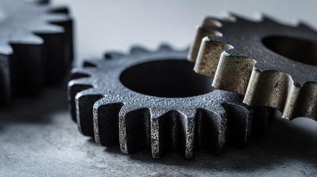 メカニズム。シンプルなグレーの背景に、すっきりとしたラインと柔らかな照明を配した金属製のギア機構のコンセプト。製品発表資料。