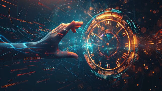 Abstract technology background with futuristic digital clock face and time hand representing business growth, currency investment, and stock timer economy transformation concepts
