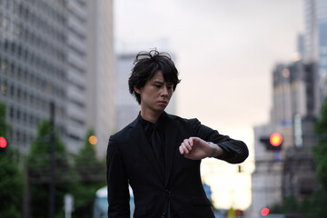 夕暮れの街中で腕時計を見る若い男性