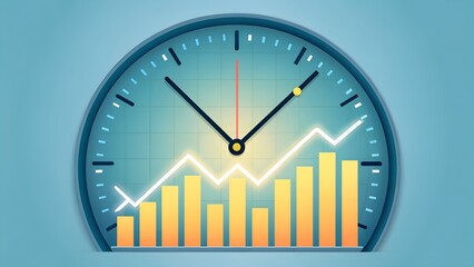 Conceptual illustration of time and financial growth depicted with clock hands overlaid with ascending graph and bar charts for business concepts