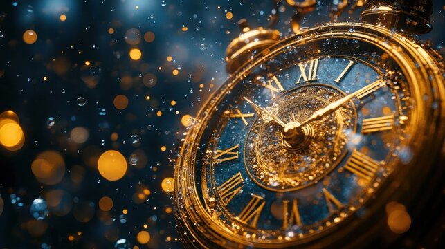 Midnight countdown with a vintage clock striking twelve amidst sparkling lights and festive atmosphere