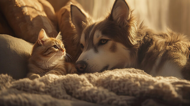Dog and cat joyfully playing in close interaction