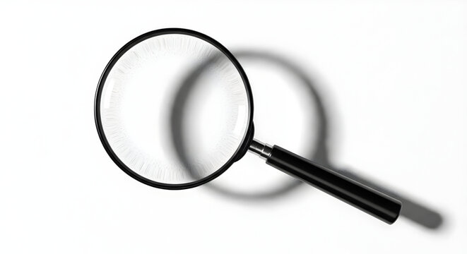 Classic Black Magnifying Glass on White Surface — Close‑Up for Search, Investigation and Research