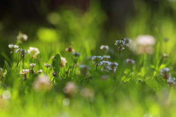 Close Up Of Fresh Grass And Flowers With Water Drops In The Early Morning