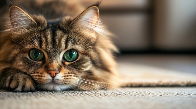 Portrait of a siberian cat with green eyes lying on the floor at home Fluffy purebred straighteared long hair kitty Copy space close up background Adorable domestic pet concept : Generative AI