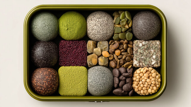 A green container filled with a variety of nuts and seeds. Concept of abundance and variety, as there are many different types of nuts and seeds in the container