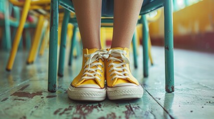 Playful person wearing a large yellow chicken costume with sneakers in a crazy scene