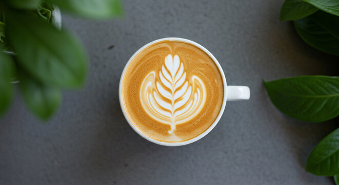 A white coffee cup with latte art heart on a gray marble surface in a close up studio shot view