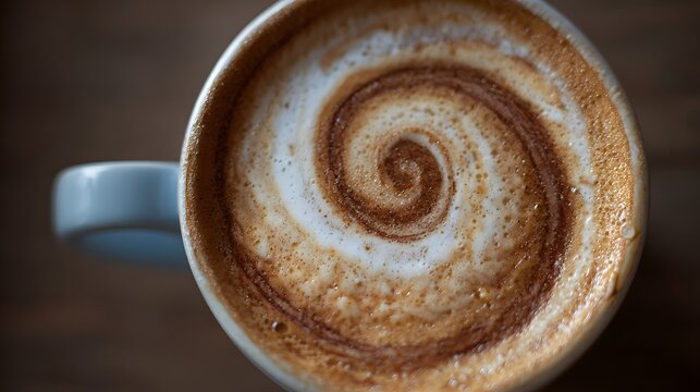 Closeup ceramic cup with creamy microfoam and latte art swirl, cozy coffee texture