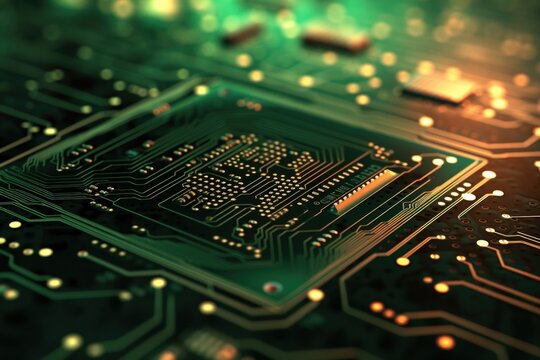 A close up macro photo of a generic technology motherboard circuit board (pcb) light with a green flash gel on a diagonal angle