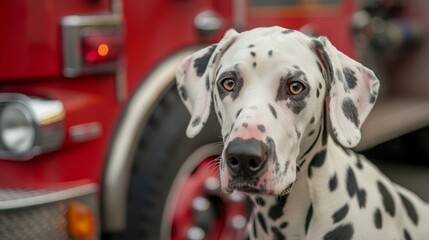 Close Up of a Dalmatian Dog in Front of a Red Fire Truck