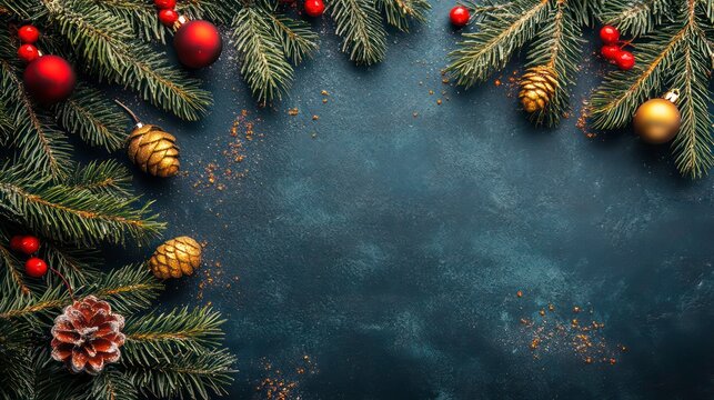 Beautiful Christmas Background with green fir tree brunch close up. Copy space, trendy moody dark toned design for seasonal quotes. Vintage December wallpaper. Natural winter holiday forest backdrop