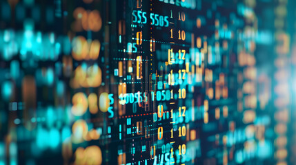 Close up of laptop with abstract creative business charts and binary code hologram on blurry background. System engineering and digital transformation concept. Double exposure.