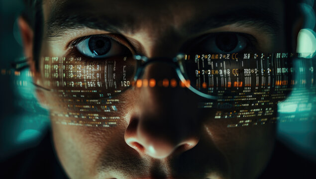 A Hacker's Focus: A Close Up of a Person Wearing Glasses Reflecting Code