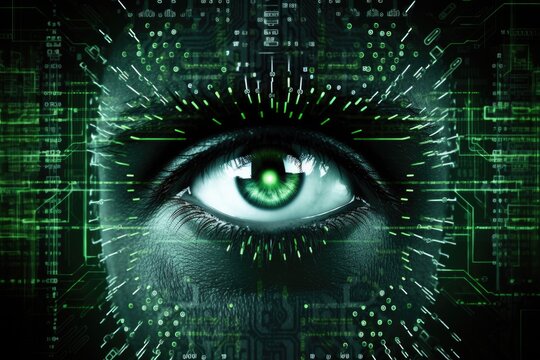Close up of woman's eye against digital background with binary code concept
