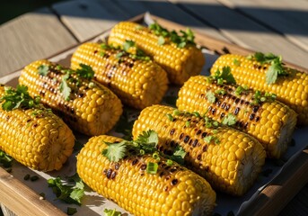 Close up of freshly grilled corn on the cob sprinkled with fresh green herbs served outdoors on a wooden tray