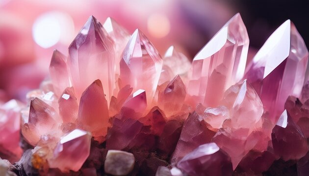 Glowing pink quartz crystal cluster with translucent facets illuminated softly, creating warm and magical atmosphere in close up studio shot