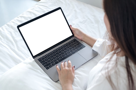 Mockup image of an Asian woman sitting on a bed , using and typing on laptop with blank white desktop screen keyboard