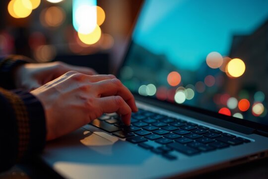 Person typing on a laptop keyboard with a cityscape reflection on the screen in close-up view.