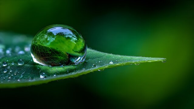 Close up of a water droplet on a green leaf with a blurred green background in a nature setting