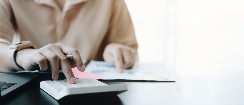Close up of businesswomen or accountant using calculator calculate while working analytic business report on the workplace, Planning financial and accounting concept.