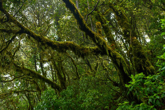 Tree bark texture covered in green moss and small ferns, humid forest environment, rich detail and organic patterns