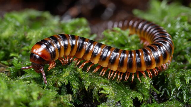 Colorful millipede crawling on lush green moss in a damp forest environment during daylight hours