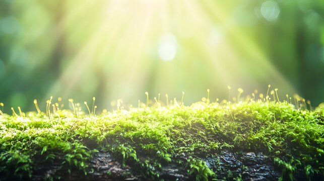 Close up of moss covered log in forest setting. Old tree branch with green moss. Sunlight filters through the trees. Woodland background natural environment.