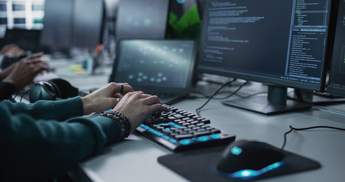 Close up of hands typing on a laptop keyboard with lines of code displayed on the screen, showing the dedication and focus required in programming and development work.