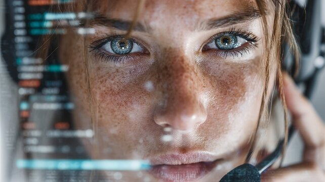 Close up of a woman's face with freckles looking at a digital display with code