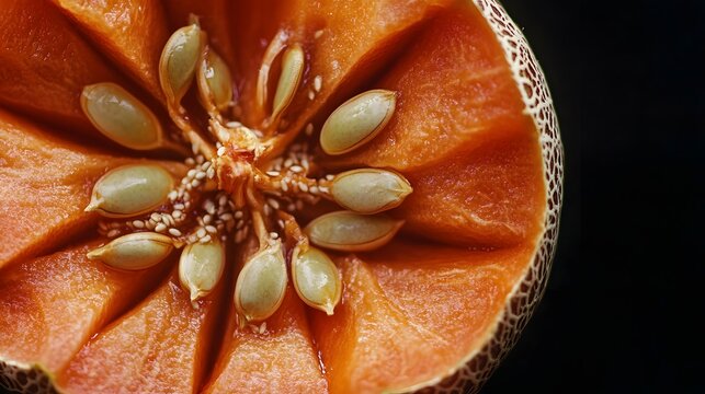 Close-up photograph of a halved, orange fruit with numerous seeds and a central core.