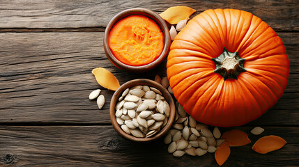 Fresh pumpkin with seeds and pulp on wooden table, showcasing autumns bounty