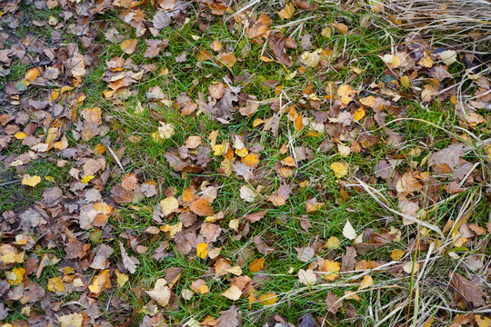 Damp fallen maple leaves covering ground close-up, autumn leaf litter texture