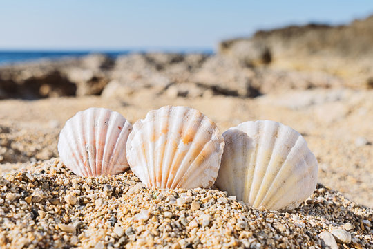 Close up view of three seashells in sand on beach of the sea coastline. Zen and relaxing wallpaper concept, toned