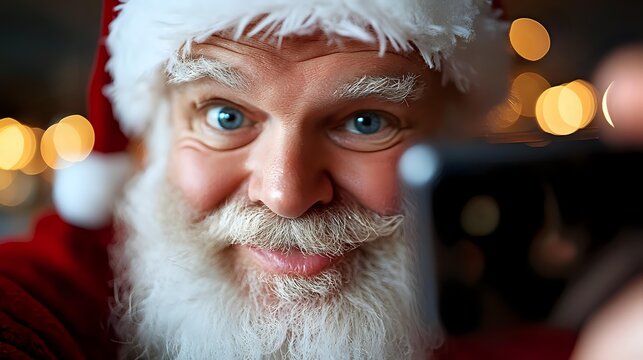 Close up portrait of smiling senior man with natural white beard wearing red and white Christmas hat against blurred holiday lights background, festive winter season.