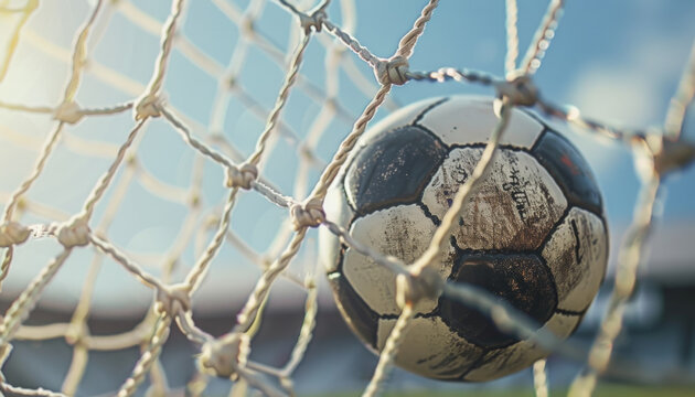 Dramatic Close Up Soccer Ball Inside the Net Celebrating Goal Moment. Ai Generated Images