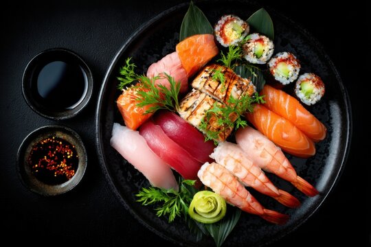Elegant arrangement of assorted sushi with soy sauce and chopsticks