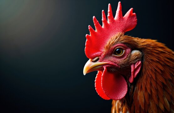 Highdetail image of a rooster's head, showcasing its vibrant red comb and wattles against a dark backdrop