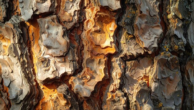 Close up of detailed tree bark texture illuminated by warm golden hour sunlight showcasing rough surfaces and natural patterns
