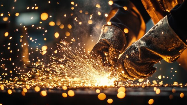 A close-up captures a welder's hands working meticulously on metal, as sparks fly brightly against the backdrop of an industrial workspace, signifying craftsmanship and dedication.