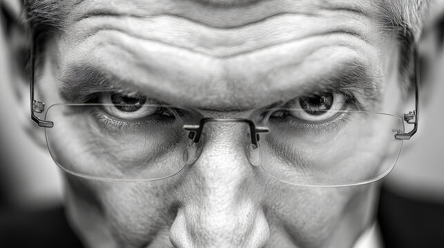 Intense focused man with gray hair wearing rimless eyeglasses looking directly at camera close-up portrait showing facial wrinkles and serious expression in black and white