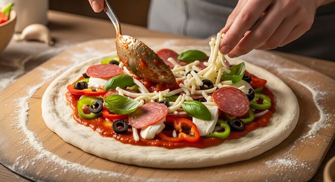 Hand Spooning Tomato Sauce onto Pizza Dough, Culinary Preparation Close Up