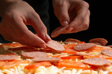 The chef cooks pizza, spreads salami on the background with ingredients. Recipe book, menu, home cooking. Close up macro