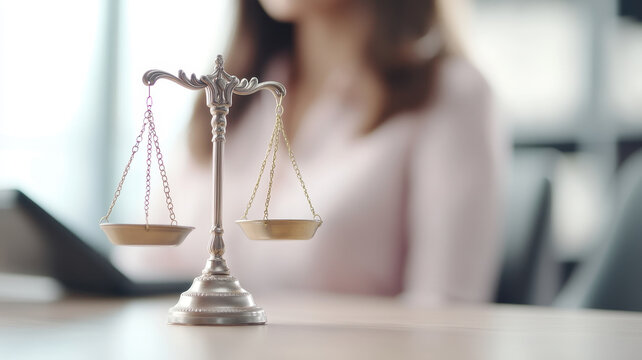 close up of traditional balance scale symbolizes justice, with blurred female lawyer in background, representing legal profession and its values
