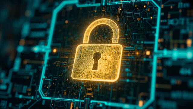 A vibrant, glowing gold padlock icon, composed of small light dots, is prominently displayed on a dark, complex circuit board.