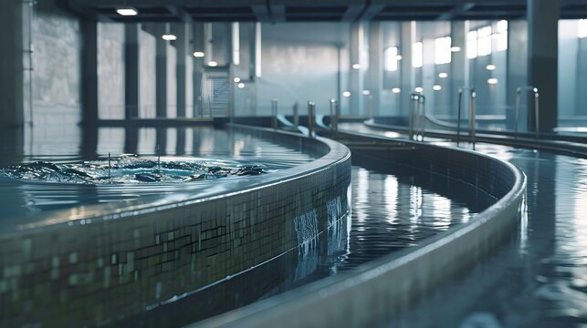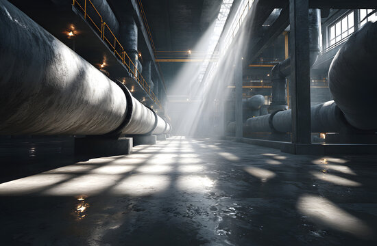Industrial pipes transport water through a facility. The closed-loop water system recycles liquid. Sun shines through large windows on the factory floor.