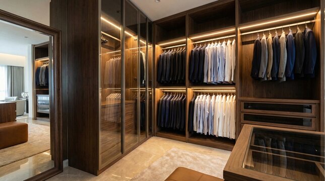 Luxury modern walk-in closet interior with dark wood and LED lighting