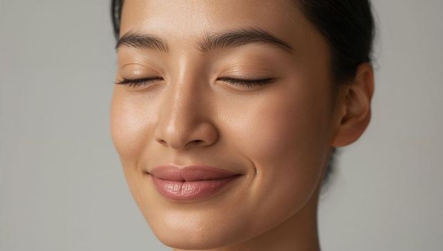 Serene smiling asian woman with closed eyes closeup showing natural skin texture and glow