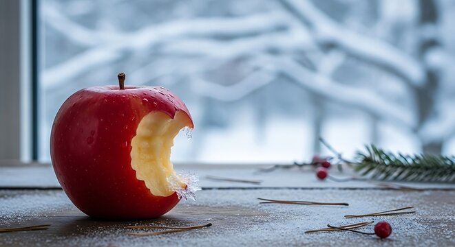 Red Apple with Bite Mark on Wooden Table in Winter Background