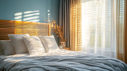 Woman opening curtains in cozy bedroom